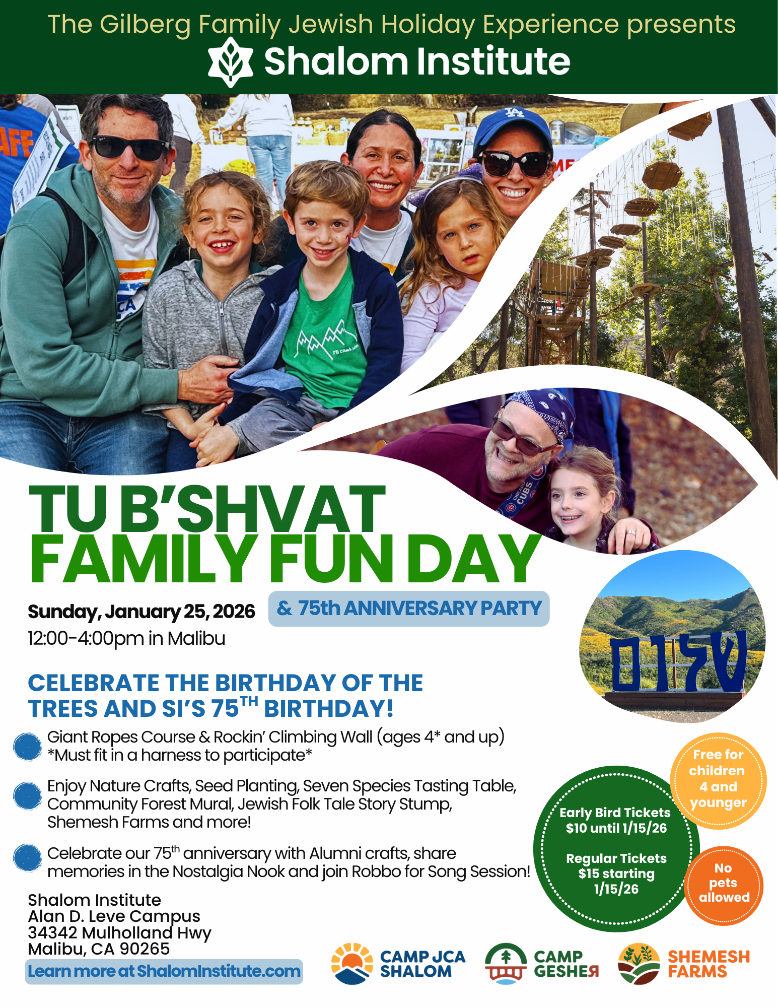 Shalom Institute - Alan D. Leve Campus 34342 Mulholland Hwy, Malibu, CATu B’Shvat is the Birthday of the Trees, and we’re throwing them a party! Join us for an afternoon of climbing, creating, singing, and celebrating in nature as our campus transforms into a living forest full of joy, adventure, and hands-on fun. Make nature art, plant seeds, dance with Robbo at our amphitheatre concert, and […]
